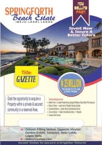 Step into the warm embrace of Springforth Estate, where family life flourishes in a secure and serene environment.Nestled along the lively Lekki-Epe Expressway in Iwerekun Community, Ibeju-Lekki, Springforth Beach Estate awaits your family's presence.